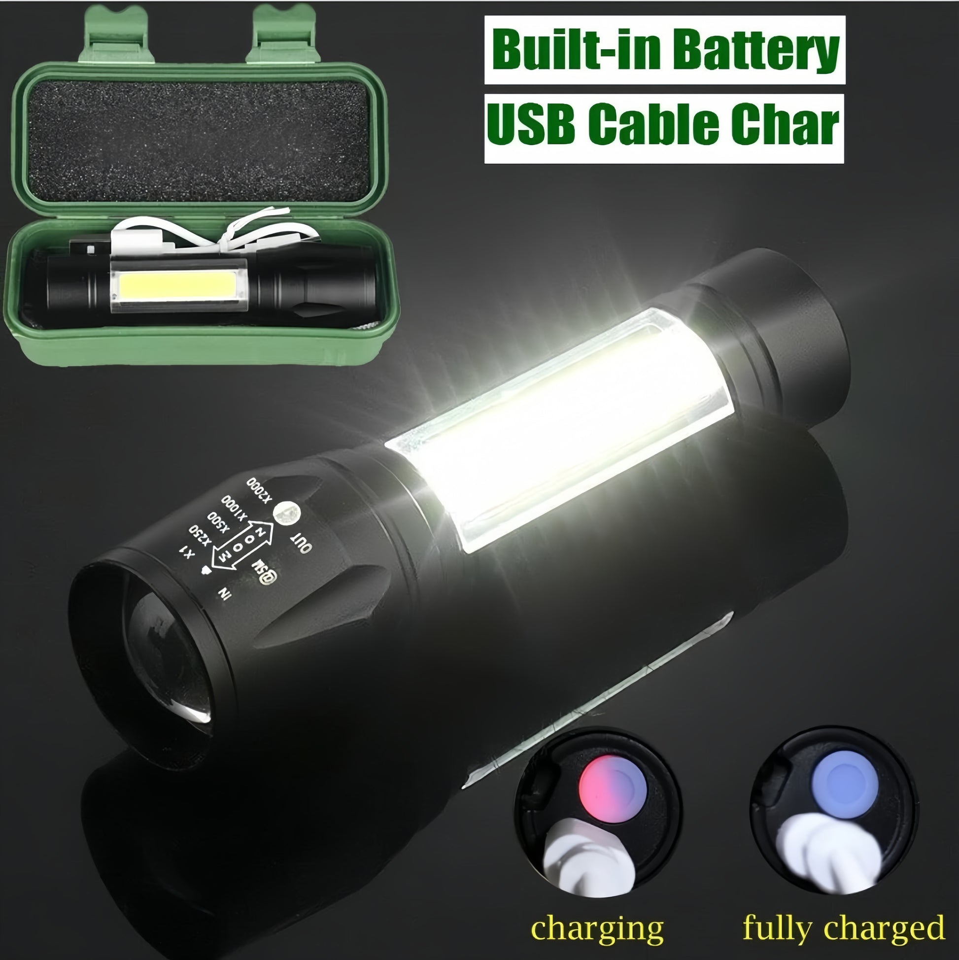 It boasts a powerful front-facing LED for concentrated beam illumination and a convenient side-mounted COB light strip, perfect for illuminating larger areas like tent , workshops, or during roadside emergencies.