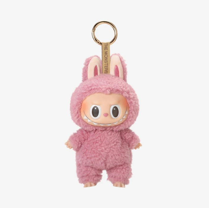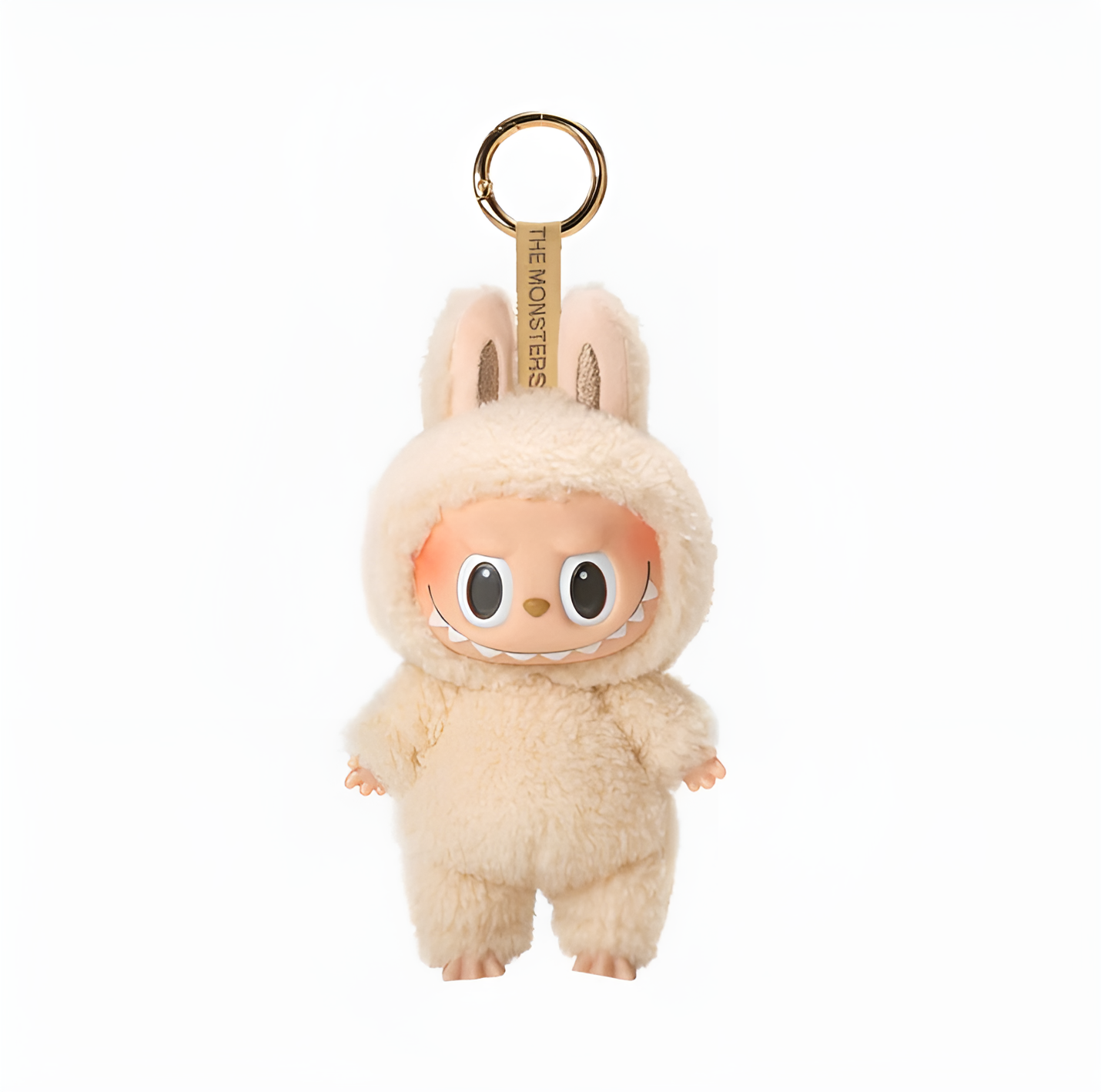 This charming collectible features the beloved Labubu character in a soft, peach-hued plush bunny suit, playfully revealing its wide, quirky grin and expressive eye.
